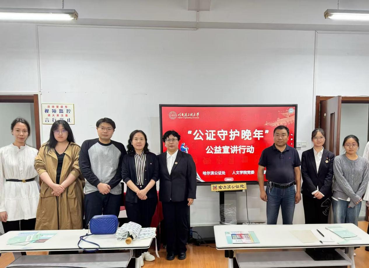 九月份是敬老月,为积极响应敬老月号召,切实提升师生对公证法律服务的认知,2025年9月24日,人文社会科学学院法学党支部联合离退休人员党委和哈尔滨公证处党支部开展了普法宣讲活动。在哈尔滨工程大学启航活动中心230教室,哈尔滨公证处专家为我校离退休教师和在校师生进行了主题为《公证守护晚年》的公证知识普法讲座。离退休处副处长付洪波、哈尔滨公证处副主任寇玉芳、人文社会科学学院法学系教师孙佳音、曾俊刚以及离退休教师和法学专业学生40余人参加普法宣讲活动。