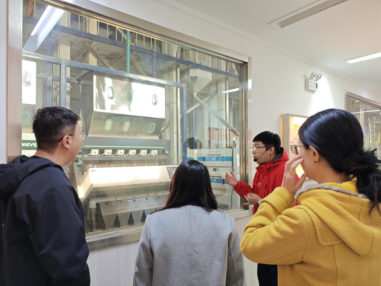 随后,支部党员师生走进生产车间,沿观光走廊实地观摩稻米自动化、智能化加工流程。精密色选、机械臂码垛等场景,让大家切身感受到科技赋能传统农业的磅礴力量。在交流中,党员师生围绕品牌建设、产业链延伸等议题,与技术人员展开热烈讨论,体现了党建活动与专业思考的紧密结合。