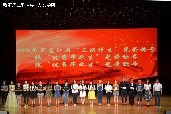 进入颁奖典礼环节。主持人宣布授予2016届黑龙江省“三好学生”光荣称号、校“优秀毕业生”光荣称号以及院“优秀毕业生”光荣称号,刘振宇书记上台给学生们颁奖。