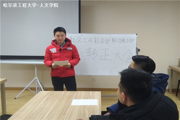 本次大会分为三个部分。第一个部分由预备党员宣读转正申请书。在申请书中,预备党员都着眼于自己这一年来做预备党员的变化,遵从党的指挥与教导,严格要求自己,使自己行为规范向正式党员所努力。他语气坚定,热情洋溢,做好了转正式党员的准备。第二个部分由社会工作社会学联合党支部部员对预备党员的申请做举手表决。部员们通过对预备党员一年的考核表现,投出自己关键的一票。仪式简洁又庄重,最后所有部员都举手通过了预备党员的申请。第三个部分,由社会工作社会学联合党支部书记宣布确立预备党员为正式党员,接受他的申请。党支部书记代表党代表党支部十分庄重地宣布这个结果,认可了预备党员的精神与表现。