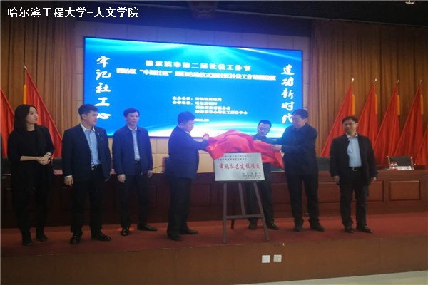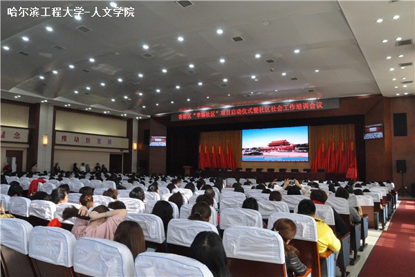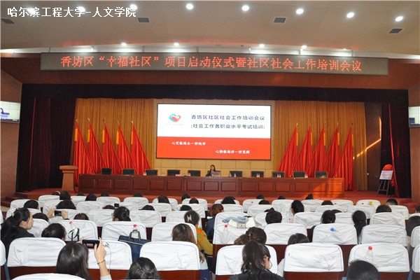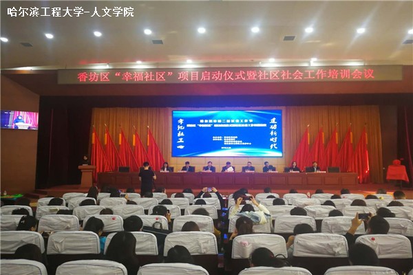 2018年3月26日,由香坊区民政局主办,哈尔滨银行、同佳岸慈善基金会、哈尔滨市心海社会工作服务中心(哈尔滨工程大学人文社会科学学院牵头成立)合作举办的“幸福社区”项目启动仪式暨社区社会工作培训会议在香坊区政府举行。香坊区民政局局长朱宝军、香坊区民政局副局长王晓东、香坊区健康路街道办事处主任冯永奇、同佳岸慈善基金会理事长韩知众、哈尔滨银行哈尔滨分行行长助理、学府支行行长王箫宇、同佳岸慈善基金会执行秘书长汪黎黎、哈尔滨市社会工作协会会长、哈尔滨工程大学人文社会科学学院副院长杨国庆、哈尔滨市心海社会工作服务中心理事长李雪等领导及嘉宾出席启动仪式。