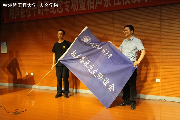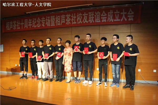 成立大会在校友庄熙的相声中热烈开场,之后,校友王安然介绍了相声茶社十年发展历史,校友办副主任郭峰宣读了联谊会组织机构名单。接着,校友办主任刘文向艺术顾问、名誉会长、会长、副会长、秘书长、副秘书长颁发聘书;校团委书记史波向相声茶社校友联谊会授校友会会旗,联谊会会长刘浩源接旗。紧接着,相声茶社校友联谊会会长刘浩源、相声茶社校友联谊会艺术顾问王刚、人文学院党委副书记曹景杰纷纷发表讲话,祝愿相声茶社不断进步,相声茶社校友会越办越好。成立大会结束后,相声茶社十周年纪念专场演出开始,韩星、王浩宇、周群利等表演《哥俩好》、《说说咱们哈工程》等多个节目。