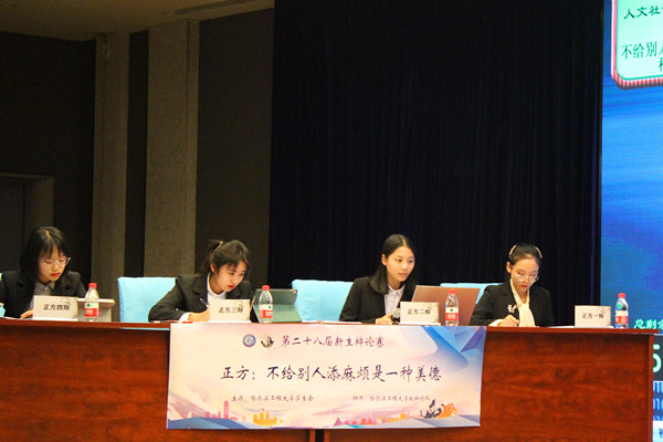 (宣传中心记者团记者 吴雨菲、王冠超报道)11月20日晚6时30分,由校学生会和校辩论队联合举办的哈尔滨工程大学第二十八届新生辩论赛总决赛暨颁奖仪式于启航多功能厅如期举行。人文社会科学学院辩论队A队王潘、邓瑾、徐嘉悦、张默涵参赛。本次比赛特邀校辩论队指导教师周莹担任裁判长,人文学院辅导员贺惠、往届优秀辩手等担任评委。