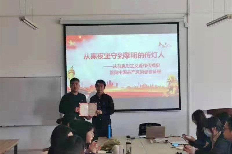 讲座伊始,刘文璟代表人文学院为齐勇博士颁发人文思政讲堂任课教师聘书;然后,齐勇博士向同学们讲解在各种革命,种种方案纷纷破产下,马克思列宁主义,给中国人民指明了方向;最后齐勇博士对本次讲座进行小结并讲述了自己的观点看法。