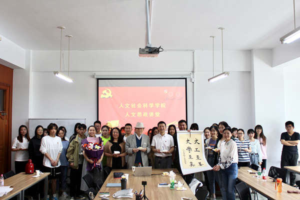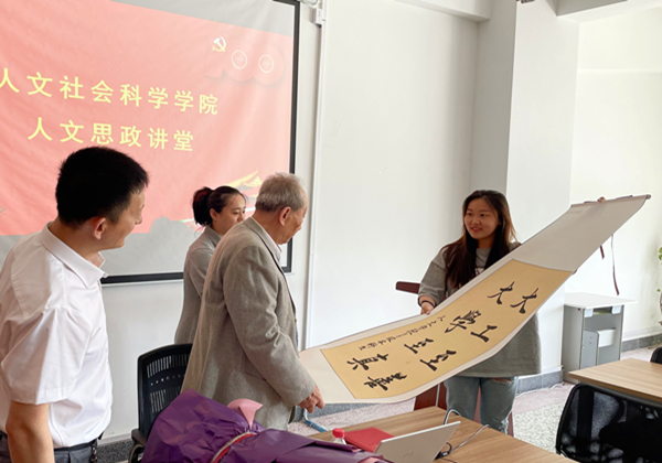 讲座伊始,曹景杰代表人文学院为徐国柱教授颁发人文思政讲堂任课教师聘书,学生代表献花。20级学生陈俊好代表学院全体同学送上自己所写的“大工至善,大学至真”书法作品。徐教授对人文学院师生们的热烈欢迎感到十分温暖,与哈工程几十年来积累的深厚感情涌上心头,盛情邀请同学们去家中做客,共同探讨院史、书法等文化。