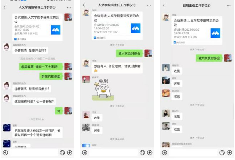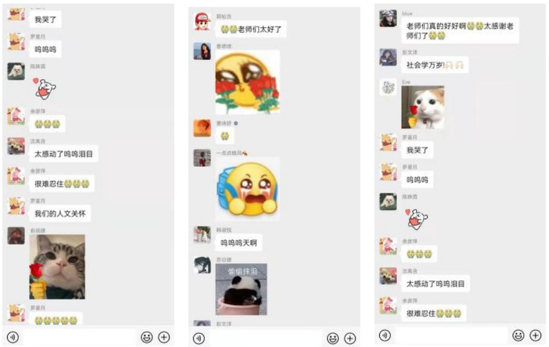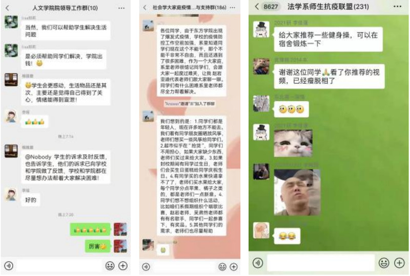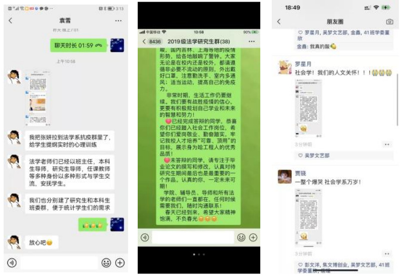 工作部署会议结束后,辅导员、班主任、副班主任、硕士生导师、党支部、基层学术组织等“战斗队”迅速行动起来,社会学系赵岩老师和法学系袁雪老师分别牵头组建了“社会学大家庭互帮互助群”和“法学系师生抗疫联盟”,老师们在群内解答同学们的各种疑问,竭力帮助同学们解决疫情带来的各种难题,并热情回应学生们的各种“吐槽”。“各位同学,目前学校的疫情防控工作空前加强,系里知道同学们现在遇到了很多困难,作为一个大家庭,系里老师很惦记同学们,也一定会跟同学们一起度过难关。同学们有什么困难都可以在群里说,系里老师们尽全力帮着解决。”这是社会学系张翼飞老师在群中对同学们说的一段话,极大彰显了学院和老师们对同学们的关心和爱护。“疫情当前,各位班干部要起到带头作用,心要稳、耳要聪、目要明,勇于担当,服务同学;学院和基学以及所有老师们都是大家的坚强后盾。”法学党支部书记刘沫茹老师及时指导学生干部如何开展工作,法学系老师和同学们也在群中展开了帮助和互助活动,有老师分享丰富的资源供同学们学习,也有同学分享了健身操供同学们学习和锻炼。同学们纷纷表示非常感动,也非常感谢学院和系里的老师们。