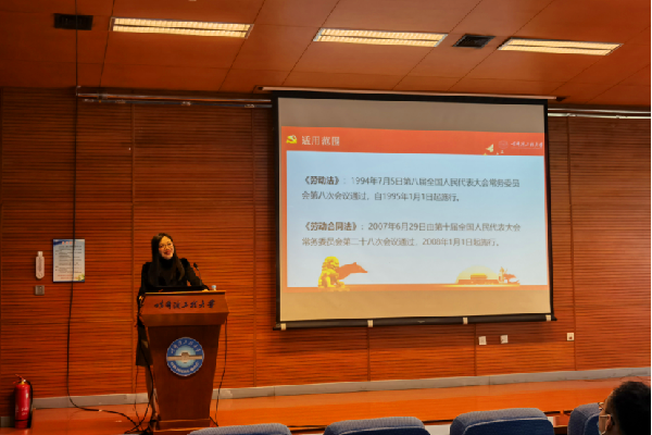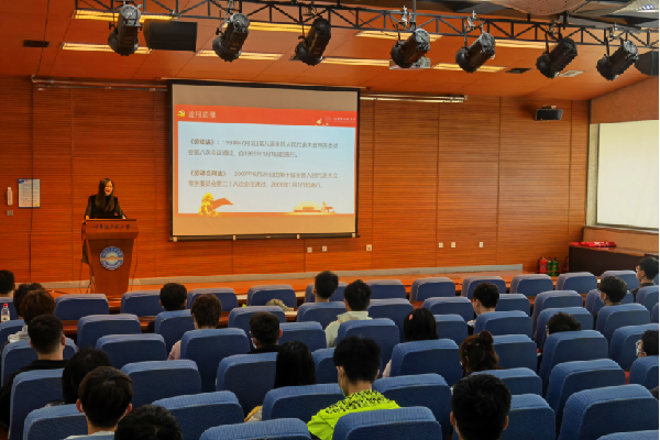 法学党支部青年党员教师许锬,将自己专业研究转化成与学生未来发展需求息息相关的党课,深入浅出地将劳动合同的订立、变更,试用期,调岗调薪,培训服务期,经济补偿与赔偿金等内容讲授给在座同学,通过案例分析让同学们更加直观的了解劳动法,帮助学生走好职业生涯第一步。