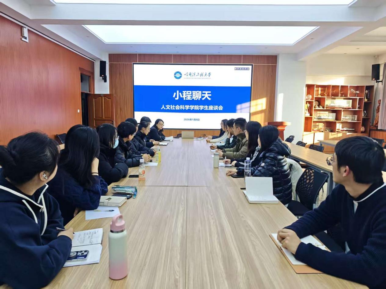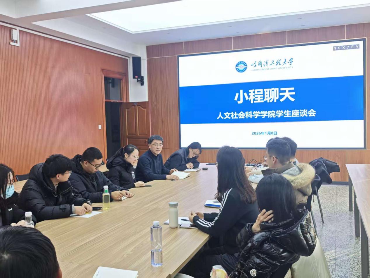 为积极响应《哈尔滨工程大学领导干部深入联系学生工作方案》要求,践行“以学生为中心”的工作理念,健全“三全育人”工作机制,2026年1月8日上午,人文社会科学学院在主楼311会议室组织开展“小程聊天”师生交流活动。学院党委书记崔彬、党委副书记吴际深入学生,与来自各年级、各专业的学生代表围坐一堂,进行了一场真诚、深入、温暖的对话。